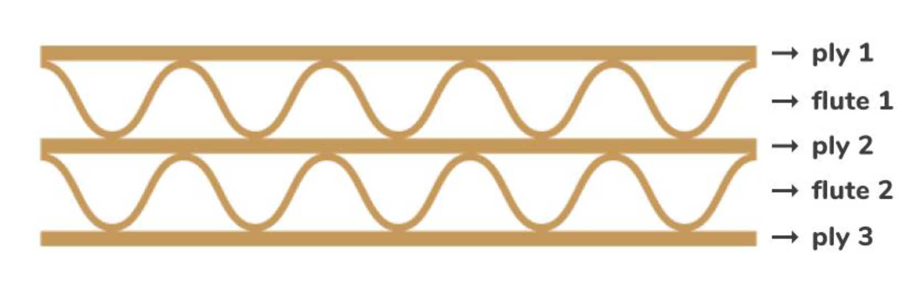 Adapun Corrugated Double Wall adalah lembaran karton gelombang yang tediri dari tiga (3) lembar ply dan dua lapisan gelombang (fluting). Double wall ini biasa banyak digunakan sebagai kotak karton corrugated untuk barang-barang yang mana membutuhkan perlindungan ekstra besar seperti minyak goreng dalam kemasan plastik (pouch), margarine, barang-barang yang cukup besar seperti kulkas, mesin cuci dan sebagainya.