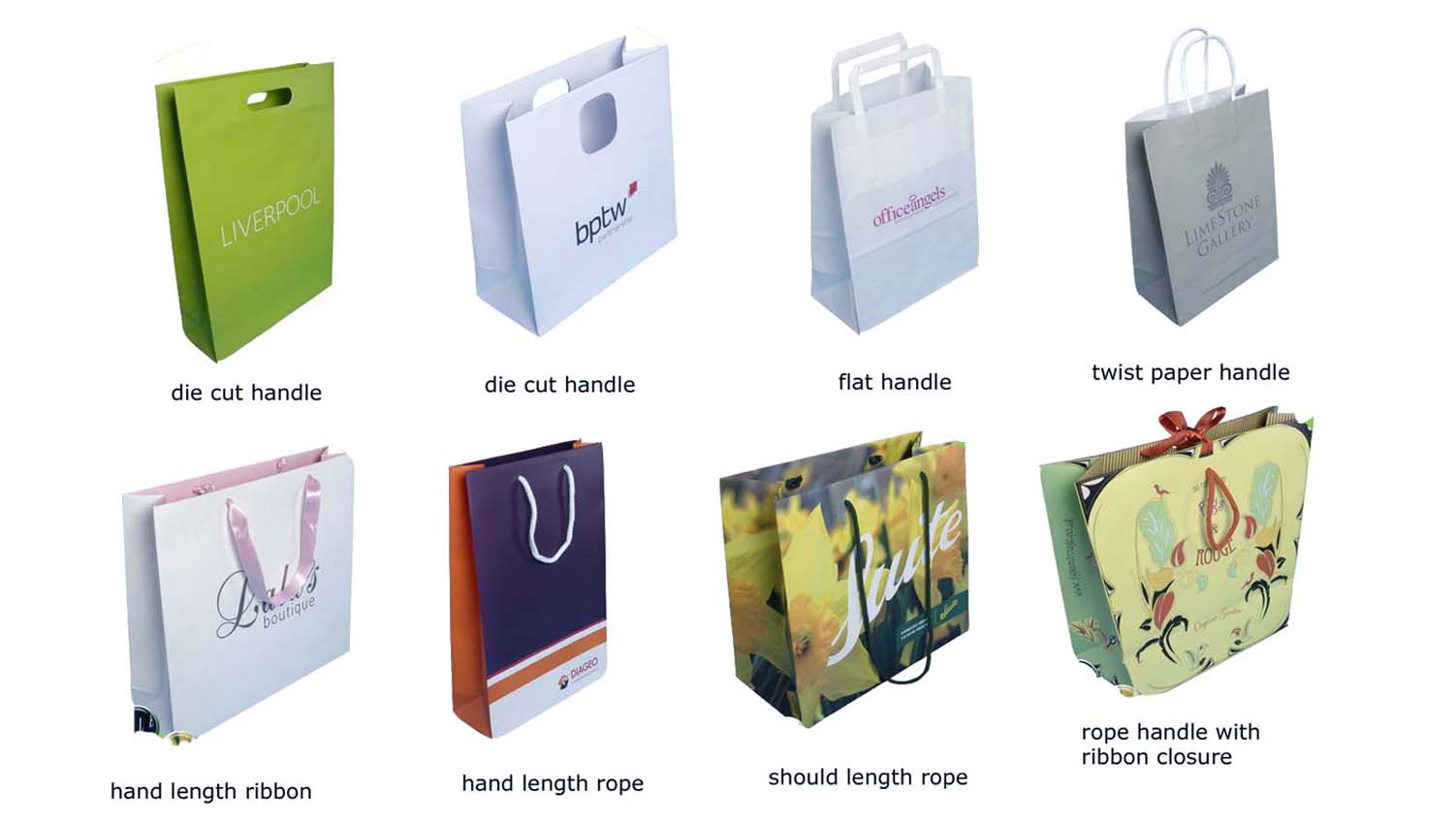 Ada beberapa variasi pilihan bahan kertas untuk cetak paper bag / shopping bag / tas kertas yaitu ; Kertas art carton, Kertas Linen, Kertas kraft coklat, Kertas Ivory, Kertas BC.