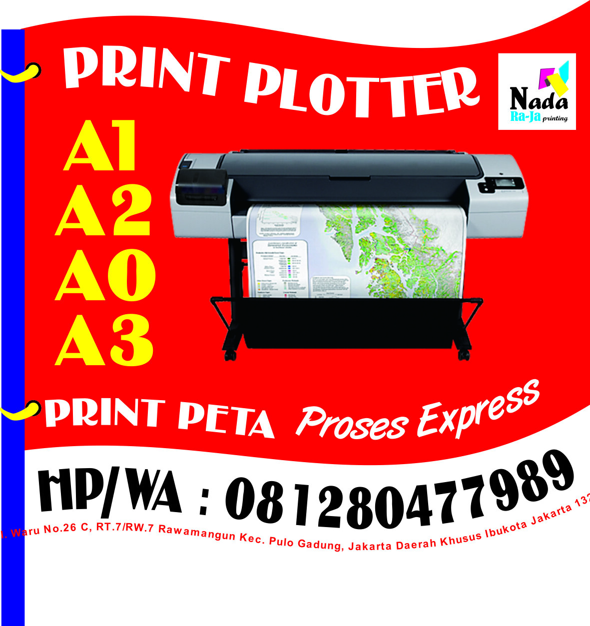 Jasa Cetak Print Plotter A0 A1 A2 A3 yang kami tawarkan kan adalah berada pada posisi tempat print A0 terdekat dari pusat kota. Tempat print A0 terdekat dari pusat ibukota yaitu kami berada di Rawamangun Jakata Timur. Jasa Cetak Print Plotter A0 A1 A2 A3 dengan menggunakan mesin print ukruan A0 dengan proses kerja tercetap di kelasnya dan jika pelanggan kami membutuhkan waktu yang terburu-buru kami tetap melayani dengan cara kami memakai rekanan dengan teman-teman kami di sekitar rawamangun ini. Dengan kata lain Anda selaku pelangan kami jangan kwatir dengan proses kinerja kami yang terpenting jika harga cocok dan file sudah ready siap cetak kami akan melayani kebutuhan Anda seberapa banyak pun dan In Shaa Allah kami akan berusaha menyelesaikan pekerjaan Cetak Print Plotter A0 A1 A2 A3 Anda sesuai waktu yang diberikan kepada kami.