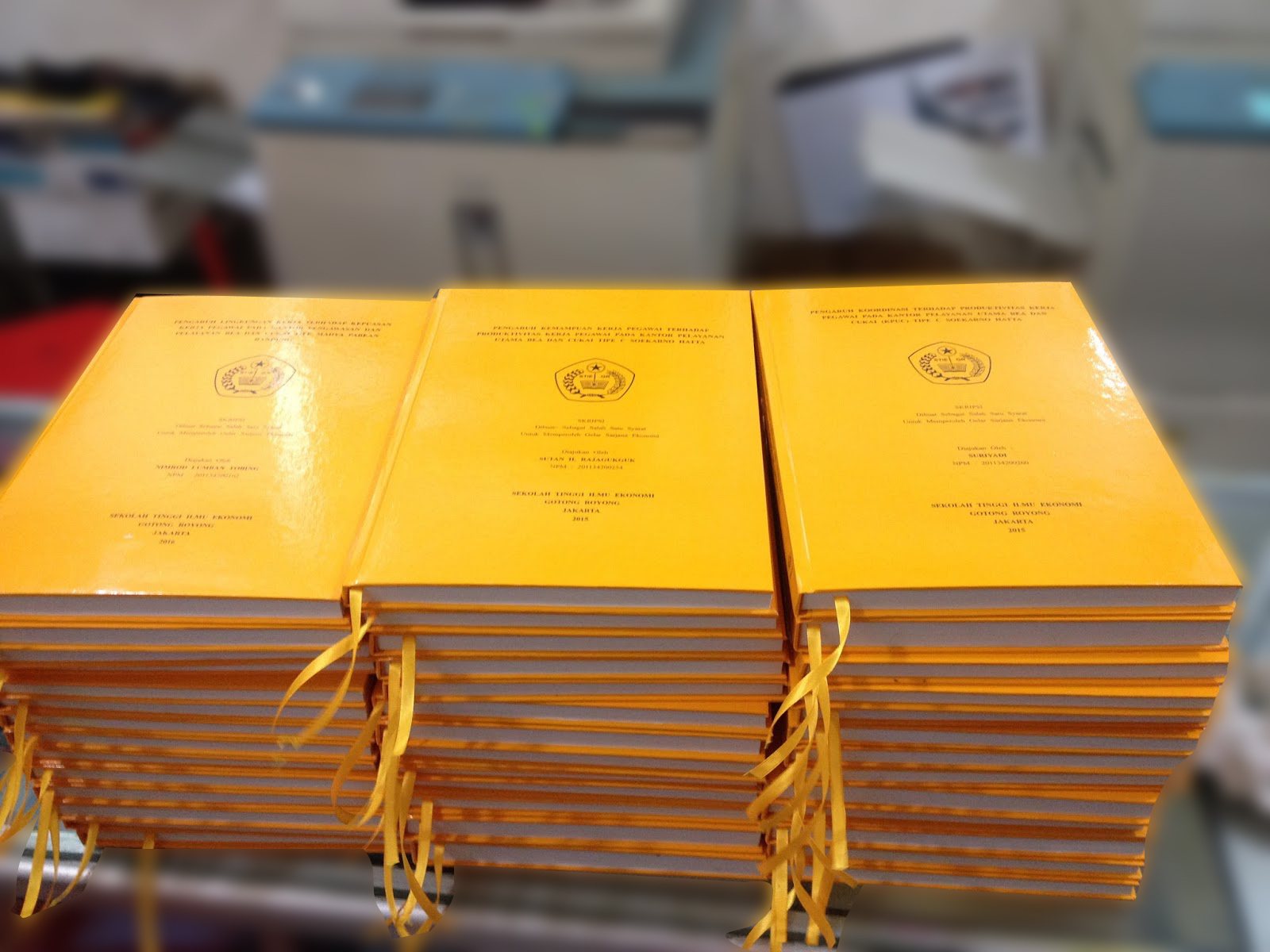 Ada juga pilihan lain yaitu jilid hard cover skripsi, dimana jilid ini merupakan jilid yang sangat dibutuhkan oleh mahasiwa-mahasiswi yang kuliah yang sedang melakukan dan menyelesaikan tugas akhir mereka yaitu tugas skripsi atau tugas disertasi ataupun tesis mereka. Jilid skripsi biasa yang diperlukan adalah kesesuaian warna yang sudah ditentukan oleh Civitas Akademis mereka. Warna cover harus sesuai dengan yang telah ditentukan kampus untuk masing-masing Fakultas. Untuk warna cover pun biasanya harus menyesuaikan dengan bahan atau merk kertas cover tersebut. Jika warna yang ditentukan oleh kampus untuk jilid hard cover skripsi mereka adalah warna biru dengan merk diamond, maka harus dipakai merk diamond. Jika dipakai merk lain, akan kelihatan beda warna karena tiap-tiap merk kertas cover jika beda merk maka warnanya pun akan beda. Maka dalam hal jilid hard cover skripsi ini kita harus jeli supaya tidak terjadi kejasalahan.
